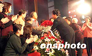 二月四日晚,北京市市民在政協(xié)禮堂舉行的紀念鄧穎超誕辰100周年的文藝晚會上,向鄧穎超塑像獻花,緬懷這位偉大的女性、慈祥的媽媽。中新社記者:史利