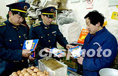 二月六日,北京東城工商分局工作人員為轄區(qū)十個集貿(mào)市場出售禽類產(chǎn)品的商戶送去新出版的預防“禽流感”的書籍。作者:羅偉