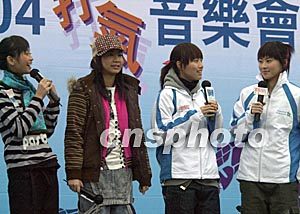 香港二月七日在維多利亞公園舉行“渣打馬拉松2004打氣音樂會(huì)”,人氣組合COOKIES成員在音樂會(huì)上演唱。中新社記者:錢興強(qiáng)