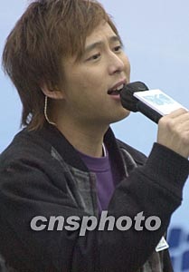 香港歌星鄧健泓,二月七日在香港維多利亞公園舉行的“渣打馬拉松2004打氣音樂會(huì)”上為歌迷演唱。中新社記者:錢興強(qiáng)