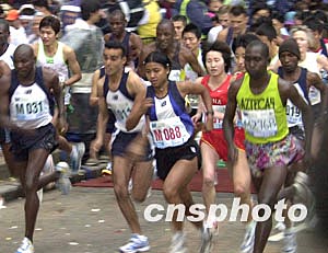 “渣打馬拉松2004”二月八日在香港舉行,超過二萬四千名香港及海外參賽者冒雨角逐。 作者:錢興強(qiáng)