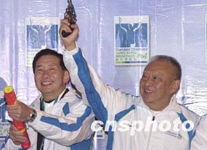 “渣打馬拉松2004”二月八日在香港舉行,香港特別行政區(qū)行政長(zhǎng)官董建華、渣打銀行大中華區(qū)總裁王冬勝在起跑儀式上為馬拉松主持鳴槍禮。 作者:錢興強(qiáng)