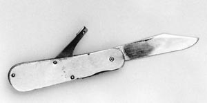 這把杜月笙生前所用的小手槍形似水果刀。杜月笙原本是水果攤學徒出身,擅削梨子,平時喜歡把玩削梨小刀。所以沒有人想到他手中的這把“水果刀”其實是一把微型手槍。這支6.35mm口徑的微型槍是在瑞士定造的,可以填裝一發(fā)子彈。杜月笙就可利用削水果的動作麻痹對方,然后出其不意擊發(fā)。兩米之內具有絕對的殺傷力。