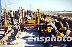 二月九日,京廣線鄭州段雙橋車站正在安裝目前中國國內(nèi)最先進(jìn)的鐵路提速道岔。列車通過此道岔的時速將由過去的四十公里提高到八十公里,并且沒有咔嚓聲。作者:慎重
