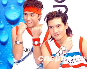 樂(lè)壇組合Boy'Z兩名成員關(guān)智斌(Kenny)、張致恒(Steven)(左)2月12日在香港出席品牌SWATCH 2004春夏腕表系列發(fā)布會(huì),兩人并為SWATCH展示新系列腕表。作者:鄧慶樂(lè)