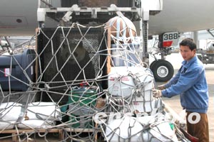 記者在成都機(jī)場貨運(yùn)出口看到,大熊貓“華美”安靜地坐在自己的籠子里,它時(shí)而漫不經(jīng)心地看著外面為給它拍照而擠作一團(tuán)的記者們,時(shí)而低頭悠閑地吃著從美國帶回的美味“洋竹”!叭A美”隨身帶有十三件行李。在它的行李中裝的全是它平時(shí)吃的玩的,有美國竹子、餅干、飲用水等。最引人注目的是還是“華美”愛玩的棕色大皮球。