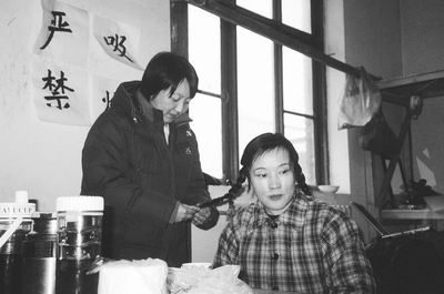 化妝間里,她正在梳辮子,一邊和聞?dòng)嵾^來看她的北影老演員樊姨聊著。在這部戲里,她演的艾蓮是右派的老婆、4個(gè)孩子的媽。穿上花棉襖,在《281封信》里時(shí)尚干練的老總一下子變成了上世紀(jì)70年代樸素內(nèi)向的母親。劉曉慶很喜歡這個(gè)造型,這讓她想起了以前拍攝《許茂和他的女兒們》、《芙蓉鎮(zhèn)》等的情景。其實(shí)她以前沒少演底層人物,只是后來看多了她的古裝美人,一時(shí)竟讓人對她的這種造型有些不信。這是她進(jìn)組的第一天,5點(diǎn)就起床出門,估計(jì)得拍到天黑。導(dǎo)演對她和李幼斌的對手戲很滿意,進(jìn)度順利。