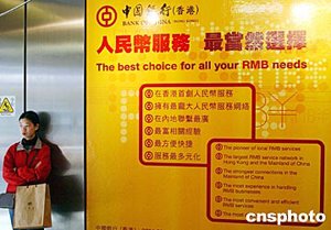 日前,中國人民銀行行長周小川來香港參加國際結(jié)算銀行會議時(shí)表示,繼人民幣信用卡已在香港使用后,香港銀行將在二月二十五日起,可以開辦個(gè)人人民幣業(yè)務(wù),包括人民幣存款和匯款業(yè)務(wù)。近日,中銀香港已在報(bào)章等媒體展開人民幣業(yè)務(wù)的宣傳,在地鐵站口人民幣業(yè)務(wù)的廣告十分醒目。作者:錢興強(qiáng)