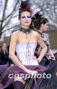 2004年2月,在英國(guó)倫敦秋冬時(shí)裝周上,著名時(shí)裝品牌Harriets Muse別出心裁,在倫敦街頭舉行服裝展示,引來(lái)許多路人關(guān)注。Ic/cnsphoto 攝