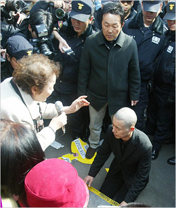 從上午11時30分起,8名慰安婦和30名韓國婦女團(tuán)體成員在該娛樂公司總部前舉行示威,要求李成延和公司負(fù)責(zé)人直接道歉。下午1時30分,抗議者表示“要讓公司負(fù)責(zé)人道歉”,并試圖闖進(jìn)公司。此時,樸智友來到眾人前,朗讀道歉聲明,并跪在慰安婦老人面前表示歉意。