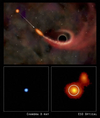 歐洲和美國天文學(xué)家18日宣布,他們借助太空望遠(yuǎn)鏡在一個(gè)距地球7億光年的星系中觀測到了耀眼的X射線爆發(fā)。科學(xué)家相信,這是被位于該星系中央的黑洞所吞噬的一顆恒星發(fā)出的“臨終呼叫”。這是科學(xué)家首次找到超大質(zhì)量黑洞撕裂恒星的強(qiáng)有力的證據(jù)。