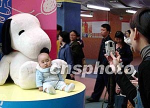 香港新都城中心舉行的「Snoopy in Fashion」國際名師時裝世界巡回展于22日結(jié)束,一家大小的市民爭相與主角史諾比合照。作者:譚達明