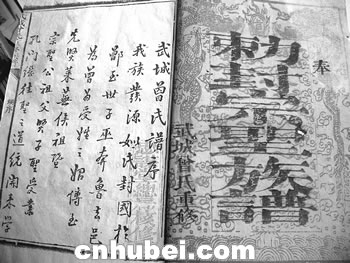 記者日前在荊州區(qū)一家名為“荊寶齋”的古玩店看到了裝在刻有“封宗氏圣族譜”舊盒里的這套線裝9冊(cè)古書,每?jī)?cè)封面上均印有《武城曾氏重修族譜》字樣,書中除詳盡的文字介紹外,還配有精美的插圖和加蓋的各種印章,其中一長(zhǎng)形印章上刻有“忠謀堂總局核修”字樣。據(jù)荊州博物館有關(guān)專家認(rèn)定,此套書印刷時(shí)間在清末或民國初年。