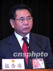 海南省三屆人大二次會(huì)議二月二十四至二十八日在?谂e行,會(huì)議將選舉產(chǎn)生省長(zhǎng)。圖為代省長(zhǎng)衛(wèi)留成在會(huì)上作政府工作報(bào)告。作者:王辛莉