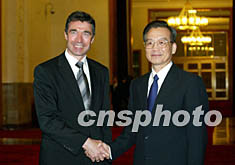 國(guó)務(wù)院總理溫家寶二十六日在北京會(huì)見丹麥?zhǔn)紫嗬鼓律。中新社記?滿會(huì)喬