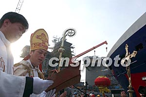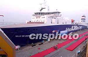 運輸世界最大客機——歐洲空中客車A380部件的滾裝船,二月二十七日在南京被正式命名為“波爾多城號”,中國神職人員出席了命名儀式并為南京金陵造船廠建成的這艘5200噸滾裝船祝福。據(jù)悉,載客555位的空中客車A380是世界最大的雙層艙客機,它特別看好北京奧運會和上海世博會的龐大航空市場。中新社記者:賈國榮