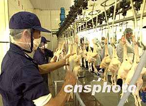 澳門特區(qū)民政總署和珠海出入境檢驗檢疫局一日在珠海舉行會議,就恢復因禽流感而中斷的活雞輸入問題進行協(xié)商并達成共識,雙方?jīng)Q定報國家有關(guān)部門批準后,從三月五日起同步恢復活雞、冰鮮雞、和凍雞的供應(yīng)。圖為在為澳門進行活雞加工的珠海科泰有限公司畜禽食品廠的活雞加工生產(chǎn)在線,工人們對宰殺后的雞只進行認真的清洗。中新社傳真 李剛 攝