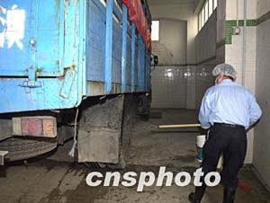 圖為裝載著禽類產品的運輸車輛在進入澳門南粵批發(fā)市場后,工作人員為車輛進行消毒。