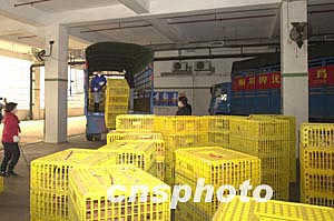 圖為澳門南粵批發(fā)市場的工作人員將首批活雞運進場內。