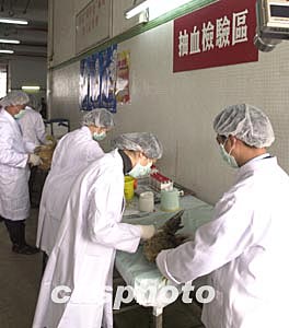 圖為在澳門南粵批發(fā)市場,醫(yī)務人員當場將雞只抽血檢驗。