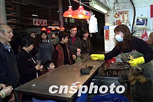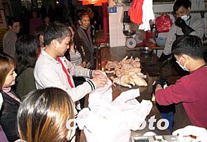 內地五日開始為澳門恢復活雞供應受到澳門市民的歡迎,經澳門衛(wèi)生檢疫部門檢驗后雞只下午開始在街市銷售,聞訊后的市民紛紛到市場排隊購買,僅一個多小時,在佑漢街市銷售的四百五十多只活雞就基本售磬。作者:李剛
