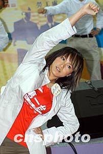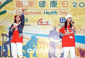 歌星何韻詩3月6日在香港出席由職安局及勞工處舉辦之《職安健康日2004》開幕典禮活動,「職安領(lǐng)隊(duì)」何韻詩帶領(lǐng)出席嘉賓及歌星進(jìn)行健康操,宣揚(yáng)職業(yè)安全信息。作者:鄧慶樂