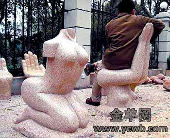 中新網(wǎng)3月13日電 “夢(mèng)澤園小區(qū)竟然擺放了兩張女性裸體造型的石椅,其中一張是下跪的女人翹著臀部當(dāng)椅子,另一張則是女性倒立舉起大腿給人當(dāng)靠背,真是丑死了!”昨日,家住長(zhǎng)沙蓉園社區(qū)的陳老師指著兩張人體藝術(shù)石椅,憤憤不平地說(shuō)。