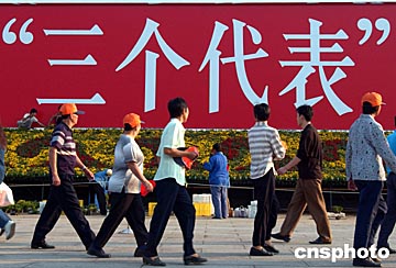 十屆全國人大二次會(huì)議三月十四日對(duì)憲法修正案草案進(jìn)行表決,“三個(gè)代表”重要思想正式寫入中國新憲法。圖為北京天安門廣場(chǎng)上的“三個(gè)代表”巨幅標(biāo)語牌。中新社記者:張煒