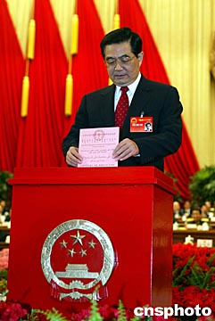 十屆全國人大二次會(huì)議三月十四日在北京人民大會(huì)堂舉行閉幕式,中共中央總書記、國家主席胡錦濤投票表決“憲法修正案草案”。中新社記者:毛建軍