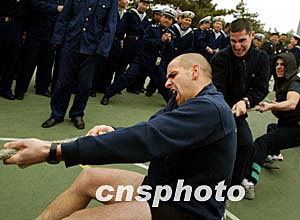 參加中法青島軍事演習的兩國官兵,三月十五日在青島三號碼頭舉行拔河比賽,增進兩軍友誼。中新社記者:宋吉河