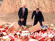 三月十五日,廣東省酒類專賣管理局在廣州從化市舉行大型銷毀假冒偽劣酒類產(chǎn)品現(xiàn)場(chǎng)會(huì),銷毀假冒高檔名酒“水井坊”、“五糧液”、“軒尼斯”、“藍(lán)帶”、“金牌馬爹里”等及假冒標(biāo)識(shí)、包裝物,共值約3500萬元。國(guó)際洋酒協(xié)會(huì)(IFSP)董事長(zhǎng)伍國(guó)豪(左)先生等到場(chǎng)協(xié)助。作者:鄧嘉樂