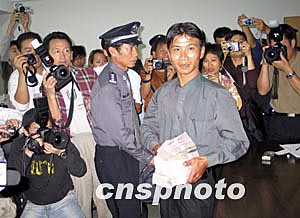 他介紹說自從公安部三月二日發(fā)布有關(guān)馬加爵的通緝令后,他始終留意這個(gè)信息。三月十五日晚七時(shí)左右他騎摩托車經(jīng)過三亞河西岸,前往第一市場(chǎng)買菜。發(fā)現(xiàn)路邊有一男子在路邊垃圾桶翻撿別人丟棄的食物和飲料,他覺得此人相貌與通緝令上的照片非常想像,他立刻與到處都粘貼的通緝令對(duì)照,認(rèn)為比較確定。在與馬犯對(duì)視的過程中,他還發(fā)現(xiàn)此人在裝瘋并且走路一瘸一拐。他立刻騎摩托前往三亞河西派出所報(bào)案。