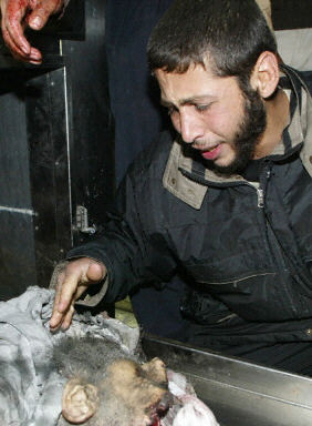 在加沙城的示法醫(yī)院里見到亞辛尸體,一位巴勒斯坦人失聲痛哭