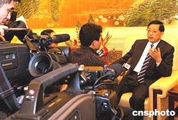 沈陽市長陳政高在北京人民大會堂接受記者采訪,介紹東北老工業(yè)基地經(jīng)濟振興問題。中新社記者:王麗南