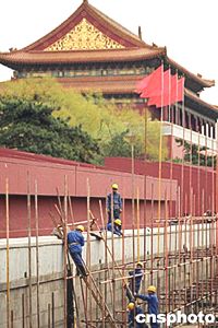 中新網(wǎng)3月25日電 3月24日,北京天安門(mén)觀禮臺(tái)翻建工程開(kāi)工,預(yù)計(jì)在今年十月一日國(guó)慶節(jié)前竣工。昨天上午,《北京晚報(bào)》記者走訪(fǎng)了觀禮臺(tái)的設(shè)計(jì)者,今年已92歲高齡的張開(kāi)濟(jì)老人。