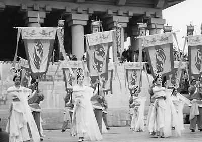 56面黃色儀仗旗在陽(yáng)光下獵獵飄揚(yáng),有“太!逼、“黃麾”旗,還有龍旗、門旗、日月旗、五星旗、風(fēng)雨旗、雷云旗、五岳旗、二十八宿旗和猛獸猛禽旗等,還有兵仗8對(duì)。最引人注目的是龍頭桿頂上高3米、寬兩米的“太!逼,旗面上繪有青色日月星辰、升龍降龍和祥云波濤。這是最高級(jí)別的儀仗旗。