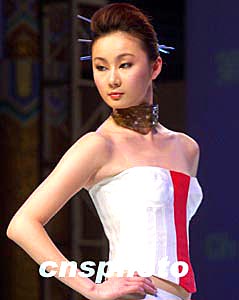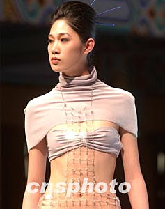 學(xué)習(xí)時裝藝術(shù)的意大利女設(shè)計師麥爾仁茲從中國古代戰(zhàn)士和廟宇建筑獲得靈感,在三月底北京舉行的國際青年設(shè)計師時裝作品大賽上,為中國靚女打造的現(xiàn)代人新裝。中新社記者:賈國榮