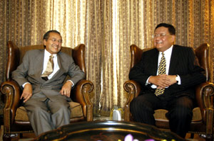 馬來西亞前首相馬哈蒂爾在代表團(tuán)下塌的酒店會(huì)見了劉長(zhǎng)樂和代表團(tuán)一行。這位鳳凰衛(wèi)視的老朋友曾在第一屆博鰲亞洲論壇上接受過鳳凰的獨(dú)家訪問,在去年的世界華商大會(huì)上又特別回答了鳳凰記者的提問,中馬建交30年前夕,當(dāng)時(shí)即將告別政壇的馬哈蒂爾接受了鳳凰主持人陳魯豫的專訪。這次的會(huì)見友好、親切,綠野集團(tuán)創(chuàng)辦人丹斯理李金友先生會(huì)見時(shí)在座。