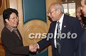 四月二日,中國國務(wù)院僑辦主任陳玉杰(左)在北京新世紀飯店會見來華的美國安良工商會訪問團全體成員。中新社記者:史利