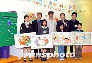 4月7日,香港郵政署發(fā)行《兒童郵票---我最喜愛(ài)的玩具和游戲》特別郵票,四位小小設(shè)計(jì)師共同展示其設(shè)計(jì)之新郵票樣本,并與郵政署長(zhǎng)蔣任宏、主禮嘉賓古巨基及贊助商于新郵票發(fā)行儀式上合照。