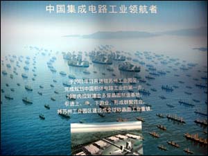 宋濤在鄭和艦隊(duì)帷幕前向記者介紹說(shuō),和艦科技是一家外資獨(dú)資企業(yè),注冊(cè)資本三點(diǎn)五億美金,二○○一年十一月進(jìn)駐蘇州工業(yè)園區(qū),第一座晶圓制造廠占地一點(diǎn)三平方公里,而蘇州給和艦科技留下了一百十公頃土地。