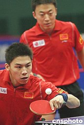四月十三日,奧運(yùn)乒乓球預(yù)選賽亞洲區(qū)男子雙打第二階段比賽北京海淀體育館繼續(xù)舉行。中國男雙選手馬琳(右)、陳杞輕松戰(zhàn)勝一對香港選手。中國隊(duì)的兩對男子雙打選手由于在第一階段小組賽中以全勝戰(zhàn)績進(jìn)入第二階段比賽,而在第二階段當(dāng)中他們各自僅負(fù)一場,成績位列參加循環(huán)賽8對選手的前兩位,雖然他們在今天晚上還有比賽,但從理論上講他們已拿到進(jìn)軍雅典的入場券。中新社記者:盛佳鵬