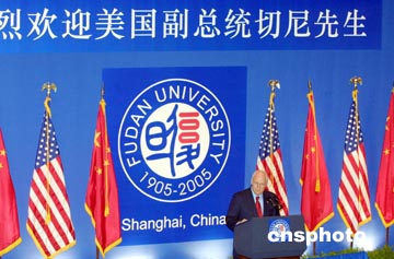 第一次訪問上海的切尼被邀請?jiān)趶?fù)旦大學(xué)發(fā)表演講。他說,中國在近幾十年來取得了非常矚目的成就。雖然五十年前,美中兩國曾是敵人,當(dāng)時(shí)彼此都視對方為重大的威脅。但他認(rèn)為這種情況已經(jīng)發(fā)生變化,因?yàn)槿缃褚紤]到雙方的共同利益,要在世界發(fā)展和平與穩(wěn)定,美中在很多問題上都共同合作。