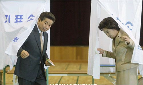 與夫人權良淑女士一同投票的盧武鉉總統(tǒng)還流露自己的感想說“今天是久違了的出門,她(權女士)為今天的出門感到很高興。”
