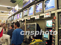 中國彩電出口美國遭遇反傾銷,美國商務(wù)部4月14日已終裁中國彩電傾銷幅度,中國彩電在美國市場“是死是活”,要等待5月27日美國國際貿(mào)易委員會(huì)對(duì)“是否存在實(shí)質(zhì)損害”的終裁。圖為美國大超市中擺滿中國生產(chǎn)的彩電。作者:余東暉