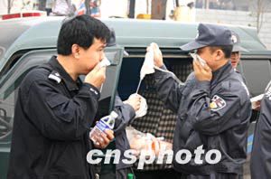 四月十七日,在重慶市天原化工總廠附近待命的警察正在領(lǐng)取口罩。十五日晚,該廠發(fā)生氯氣泄漏事故,有十五萬人撤離。作者:鄒輝