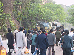 四月十八日下午六時(shí)許,離事發(fā)地中央核心區(qū)域僅兩公里的螞蝗梁拉起的警戒線終于撤下。疏散出去的附近居民歸心似箭,快步走在回家的路上,今天排險(xiǎn)過(guò)程中發(fā)炮的坦克吸引了他們.十五日晚,重慶天原化工總廠發(fā)生氯氣泄漏事件。作者:郭晉嘉 郭虹