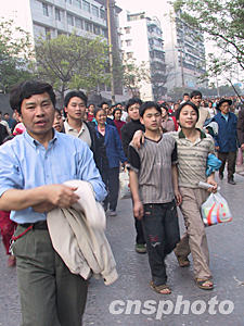 四月十八日下午四點(diǎn)多,被臨時(shí)安置在重慶市第十八中學(xué)的群眾得到"可以回家"通知,大家歸心似箭。為急于回家的群眾涌出該學(xué)校大門。作者:郭晉嘉