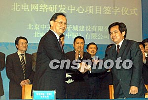 四月十九日,北電網(wǎng)絡與北京中關村電子城建設有限公司在“新北京,新奧運——中國和世界的商機”奧運經(jīng)濟市場推介會上洽談,創(chuàng)建北電網(wǎng)絡研發(fā)中心。圖為北電網(wǎng)絡全球副總裁毛渝南(左)與北京中關村電子城建設有限公司簽約。