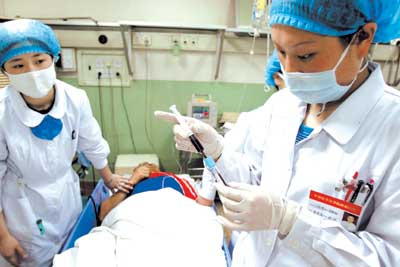下午3時(shí)25分,307醫(yī)院急診樓外停放著兩輛999急救車,有5名工人已被送進(jìn)急診室內(nèi)。在急診大廳右側(cè)的一間急救室內(nèi),一名50多歲的老人,不停地抽搐著,病床旁放著一個(gè)裝嘔吐物的大桶,兩名比較嚴(yán)重的工人則處于昏迷狀態(tài),十幾名醫(yī)生正在進(jìn)行搶救。